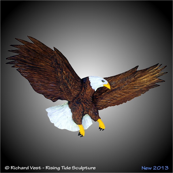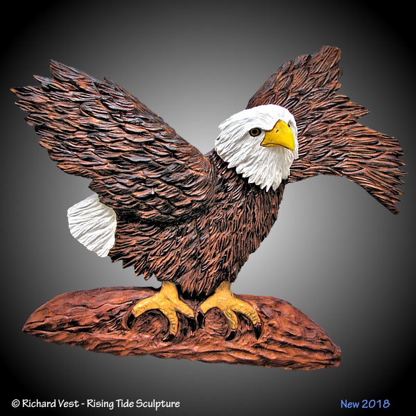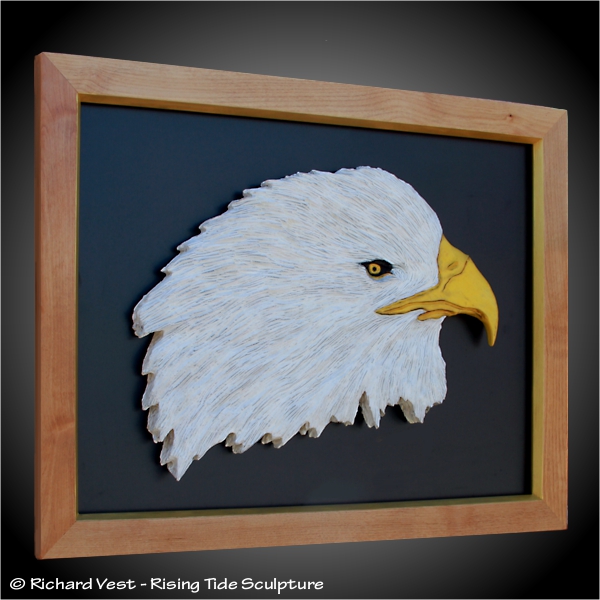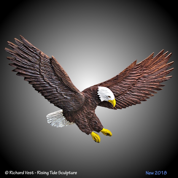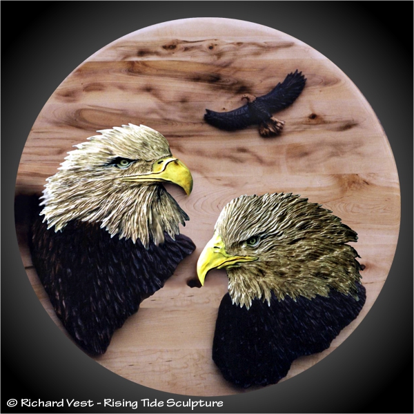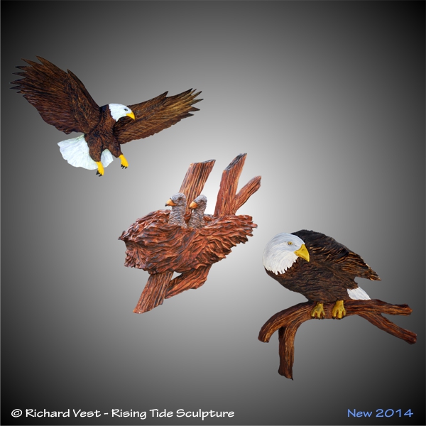 Wall sculptures, Eagles carved in Black Walnut or Alder with Walnut, yellow, white, staining. Eaglets in Alder,