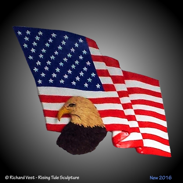 the flag is carved in Sugar Pine with red, white and blue staining. The Eagle